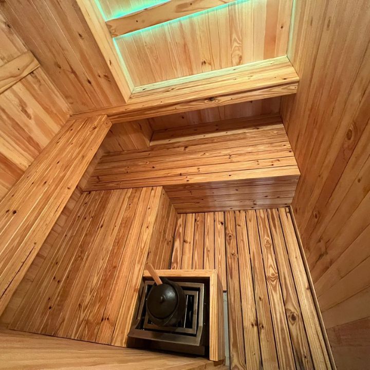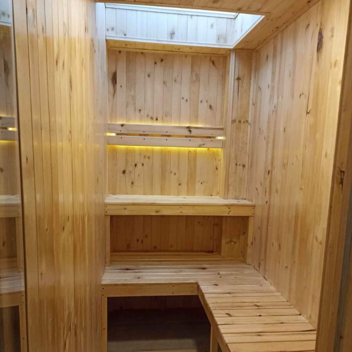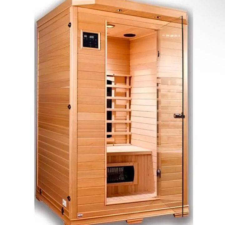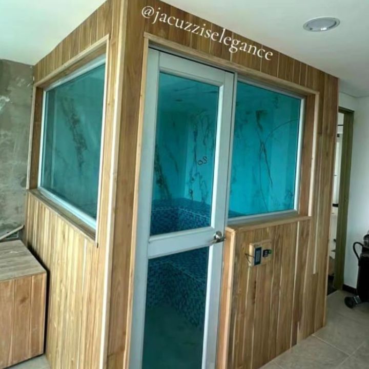Con Frente Panorámico Saunas portátiles en pino blanco, pino, caribe, pino patula Generador de calor en acero inoxidable controles digitales o termostato. Bancas rectas en dos niveles frente panorámico solo en vidrio o solo puerta.